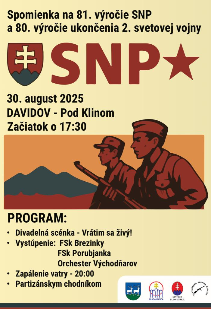 Obec Davidov, Matica slovenská, Mladá matica a Partizánska skupina Čapajev vás pozývajú na spomienku 81. výročia SNP a 80. výročia ukončenia 2. svetovej vojny. Akcia sa uskutoční dňa 30.08.2025 v Davidove pod Klinom so začiatkom o 17.30h. Čaká na vás bohatý program. Tešíme sa na vašu účasť.